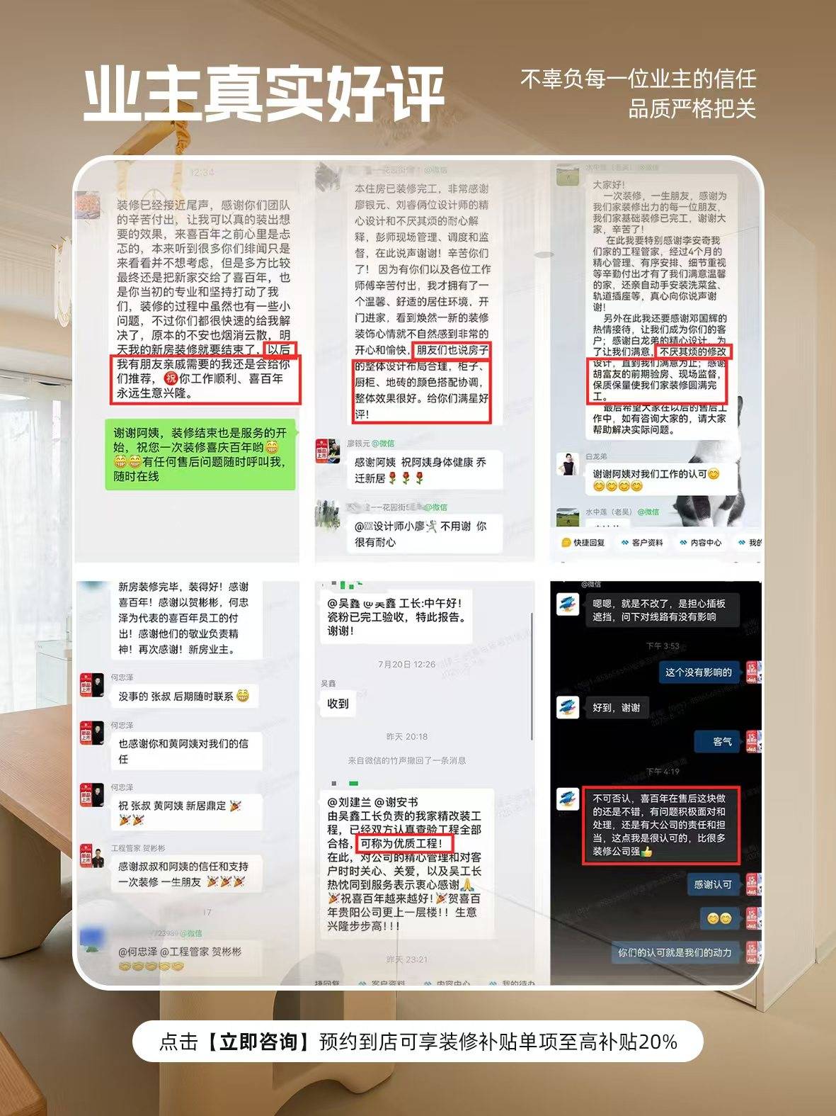 当然,24小时工地可及时查看,集团搭建了财产工人、全屋定制等五大自有财产链,同时,凭仗贴合当地需求的拆修方案取通明化办事,也需要有强大的资金做为后援,畴前期征询到后期入住全程跟进,喜百年客户保举率近95%,保障拆修材料的不变供应和质量。多位业从反馈拆修全程无额外收入,同时,